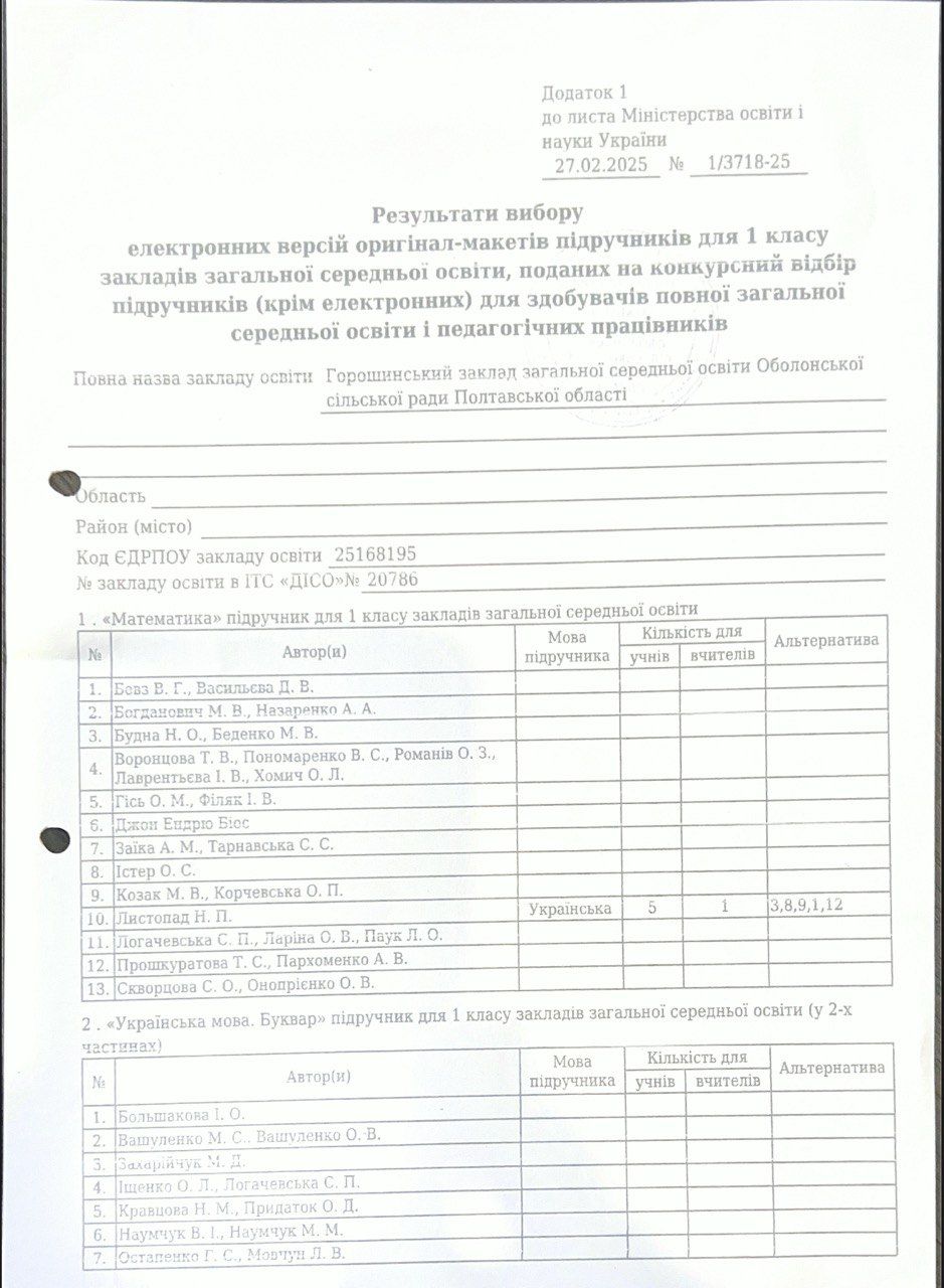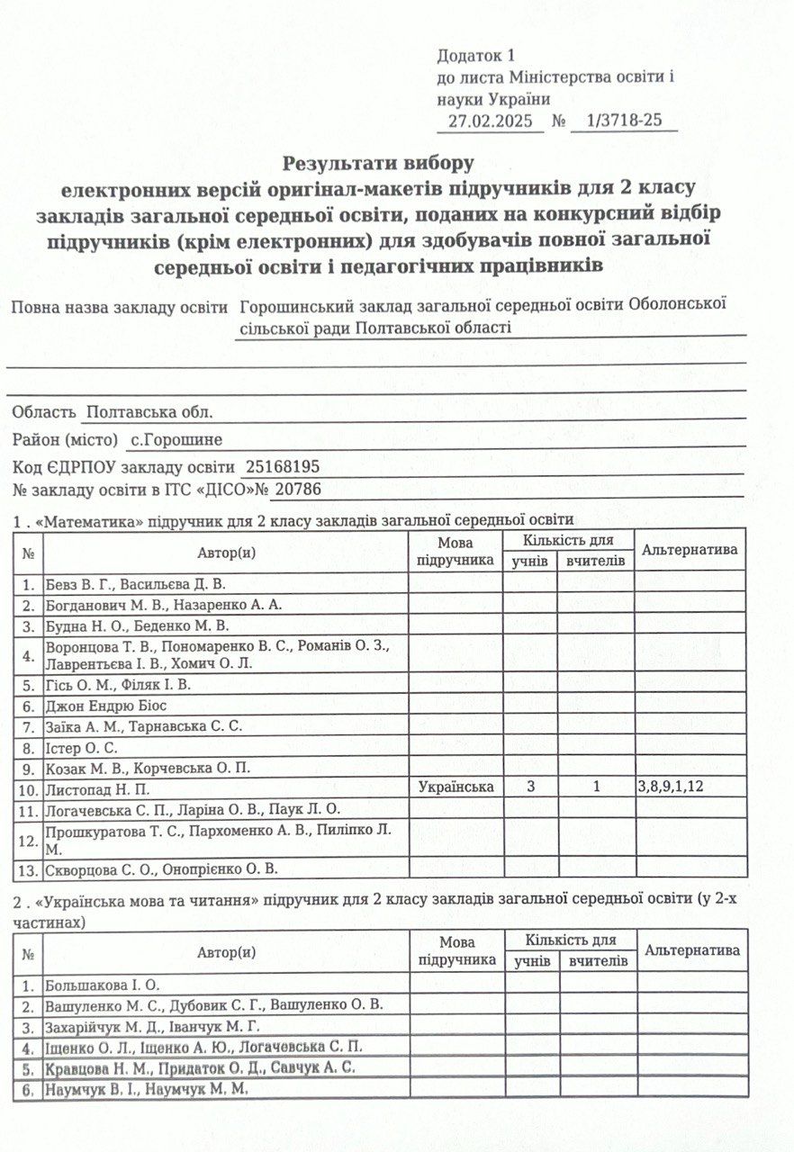 Результат відбору електронних вермій підручників для 1 класу , 2 класу