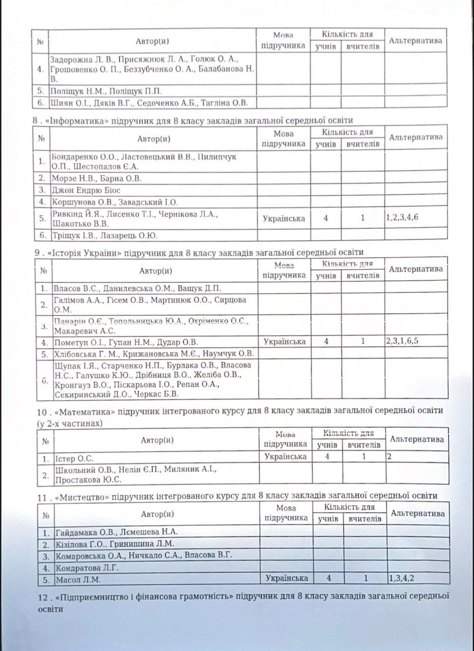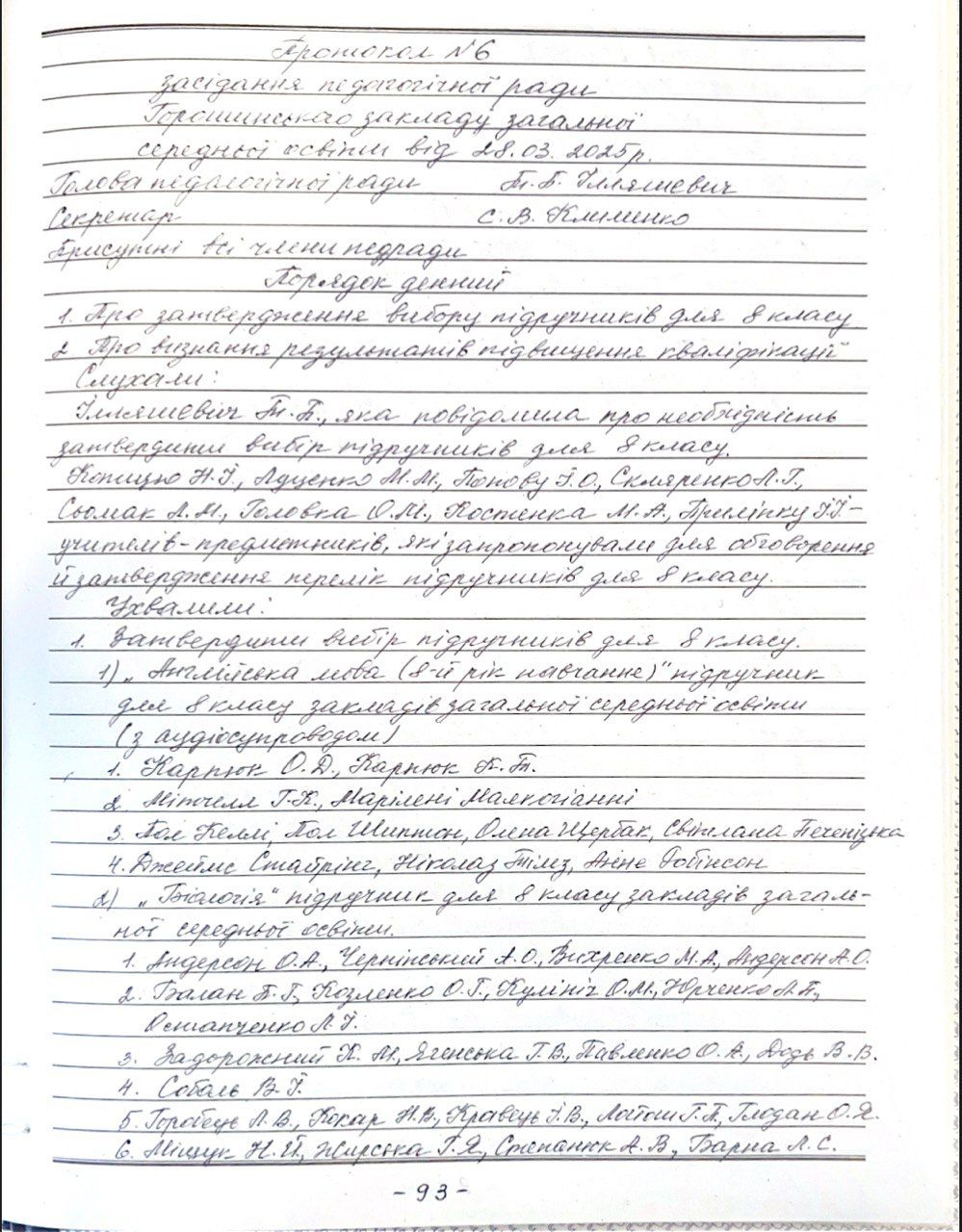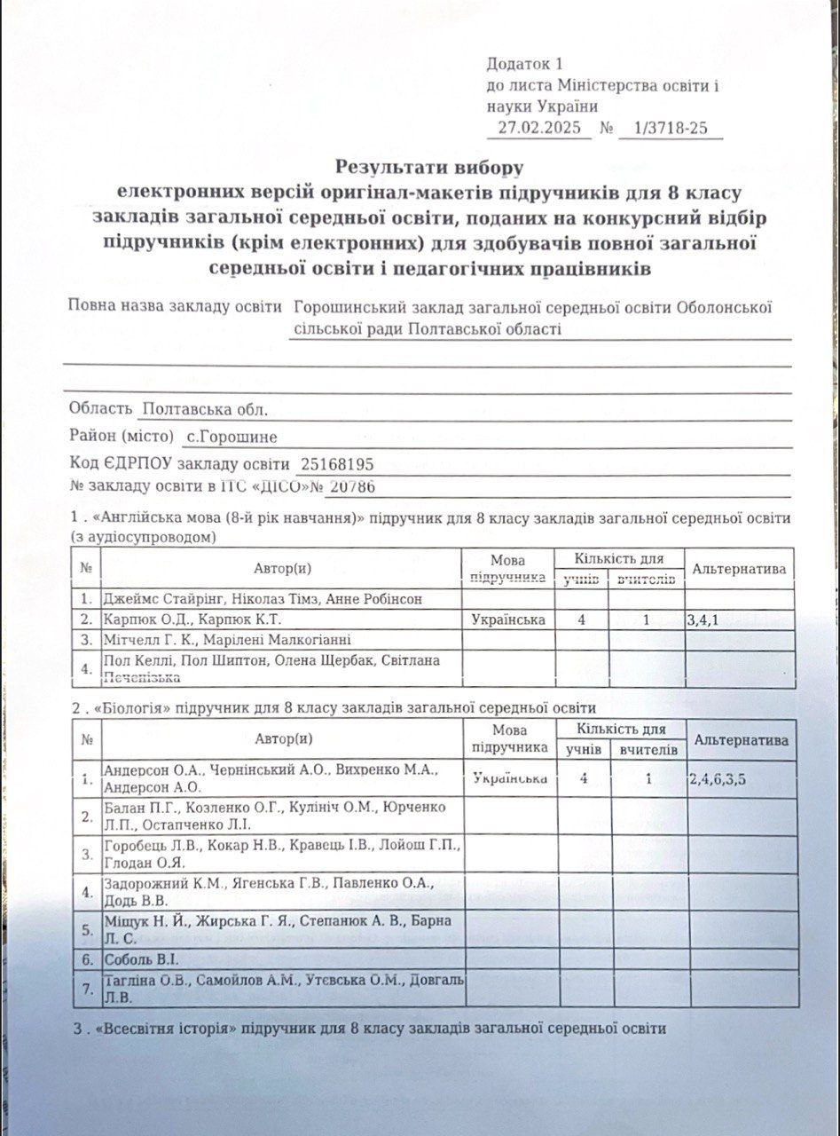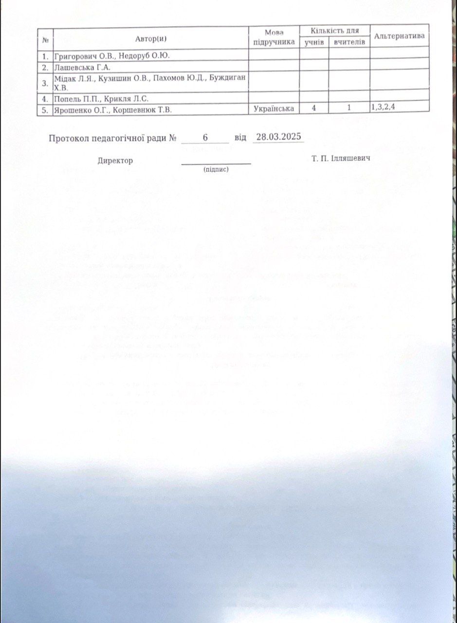 Результат вибору підручника для 8 класу , протокол педагогічної ради №6 від 28.03.2025р "Про затвердження вибору підручників для 8 класу"